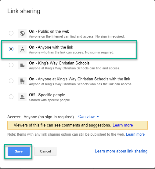 - Click to select Anyone with the Link can View. Click Save.