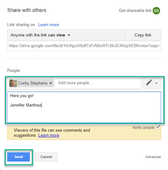 - Next, type in the names of who you'd like to share your document with. Type to add a 'note' this will appear as an email message. Click Send.