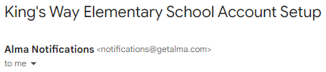 - You will receive a email from "Alma Notifications" (notifications@getalma.com) with the subject: "King's Way (Elementary/Middle/High School) Account Setup"
