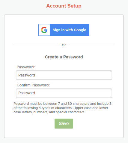 - There are two options: 1) Select "Sign in with Google" and authenticate your account with the email that your received the invitation email from. Or 2) Input a password that fulfills the requirements listed and select "Save".
