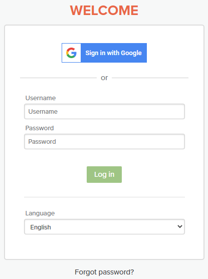 - After the page reloads, either, select "Sign in with Google" or input your Username (see activation email) and Password and select the green "Log in" button.