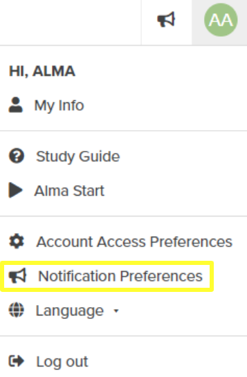 - Once you are logged in to Alma, click on your initials in the upper right corner of your screen (on Desktop) or lower right corner of your screen (on mobile) and select "Notification Preferences."