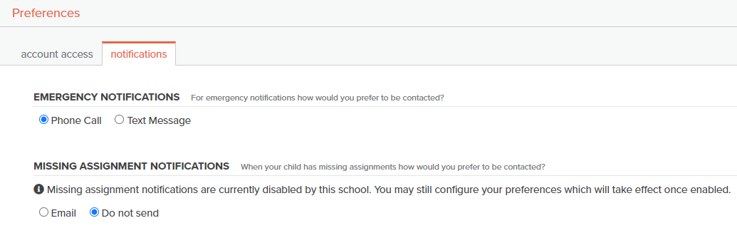 - Under "EMERGENCY NOTIFICATIONS" select either "Phone Call" or "Text Message", Under "MISSING ASSIGNMENT NOTIFICATIONS" select either "Email" or "Do not send" (only applicable for Middle & High Schools), then click the green "Save" button in the bottom right corner.