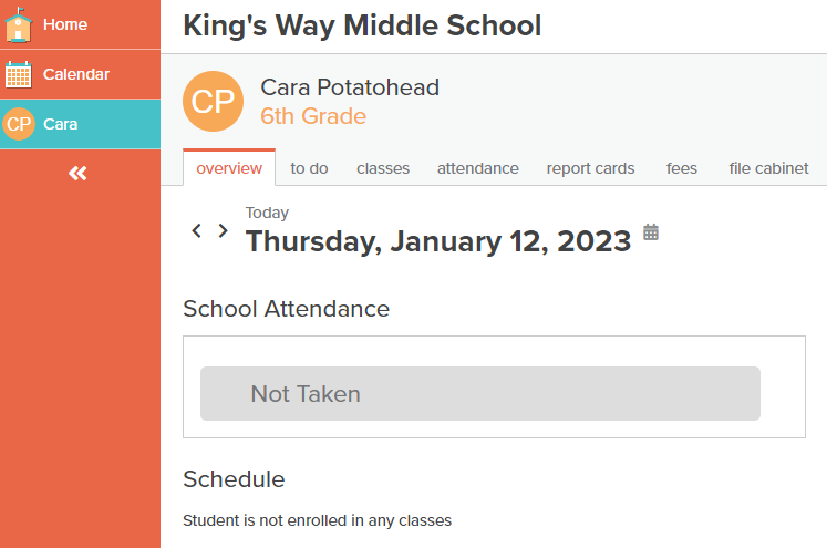 On the left side of the screen has: "Home", "Calendar", and any students for that school.